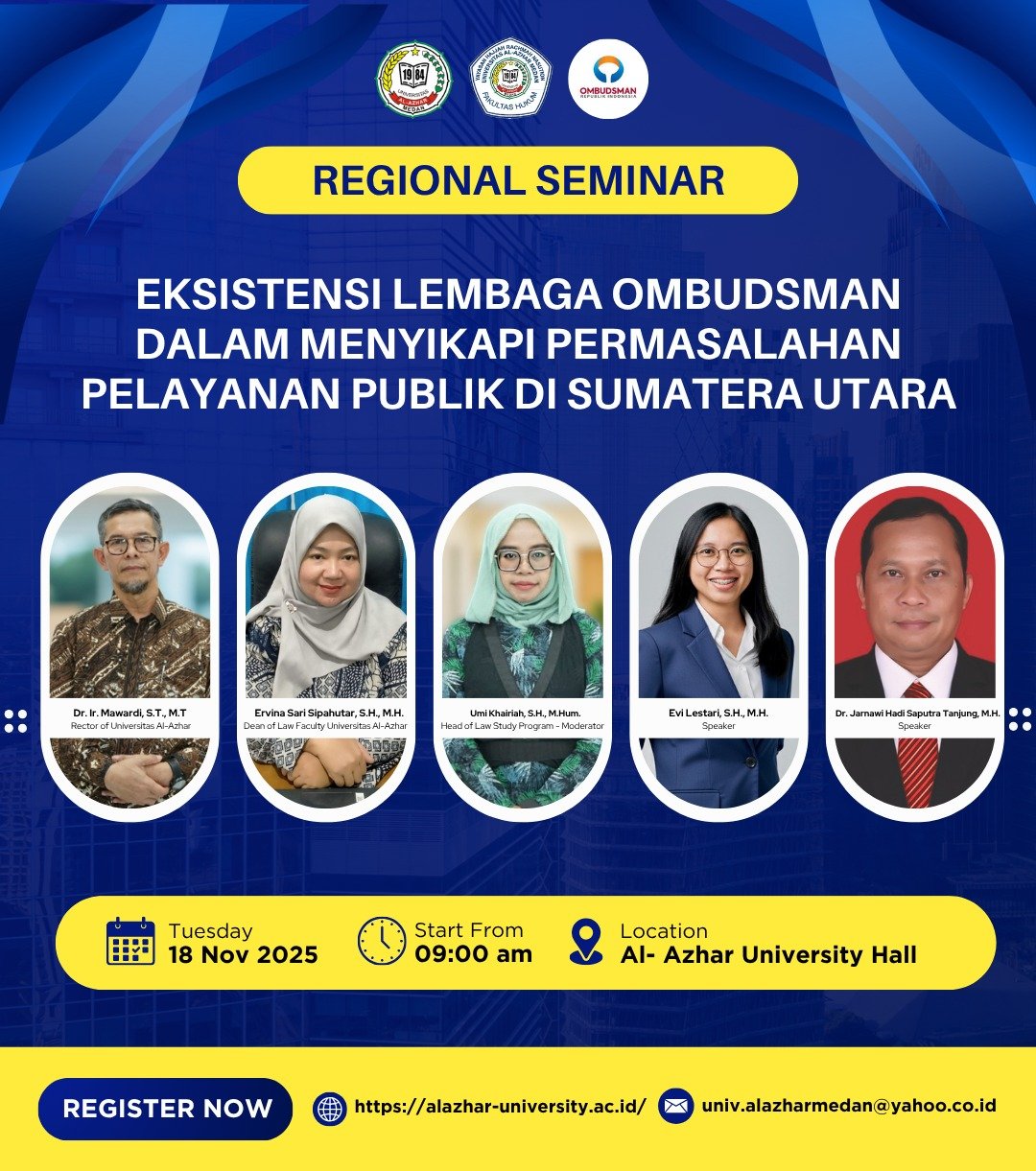 Medan, 18 November 2025 — Fakultas Hukum Universitas Al Azhar bekerja sama dengan Ikatan Mahasiswa Hukum Al Azhar (IMAHA) sukses menggelar Seminar Regional dengan tema “Eksistensi Lembaga Ombudsman dalam Menyikapi Permasalahan Pelayanan Publik di Sumatera Utara.” Kegiatan ini dihadiri oleh para dosen, mahasiswa, serta civitas akademika Universitas Al Azhar.