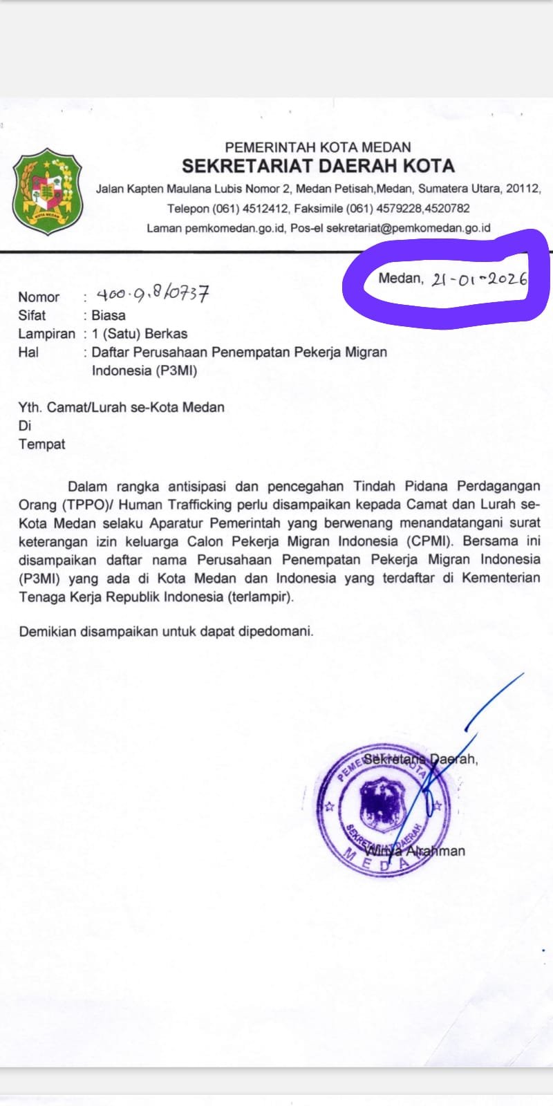Medan — Terbitnya surat Sekretariat Daerah Kota Medan Nomor 400.9.8/0737 tertanggal 21 Januari 2026 tentang Daftar Perusahaan Penempatan Pekerja Migran Indonesia (P3MI) dinilai sebagai langkah maju dalam membongkar dugaan praktik Tindak Pidana Perdagangan Orang (TPPO) yang diduga melibatkan sindikasi masif dan terorganisir.